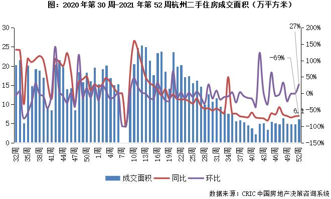 2021年第52周,杭州二手住房環比增長27%至6.1萬平方米,同比跌幅至69%。當前市場規模低位震蕩運行,本周市場有所回升,在限購、信貸和房價等多輪調控監管下,后續市場或在當前規模持續震蕩。