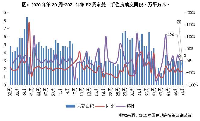 2021年第52周,東莞二手住房成交面積收3.0萬平方米,環比增長2%,同比跌幅擴大至42%。本周成交規模穩中微升,市場連續5周平臺走勢后續或將保持。