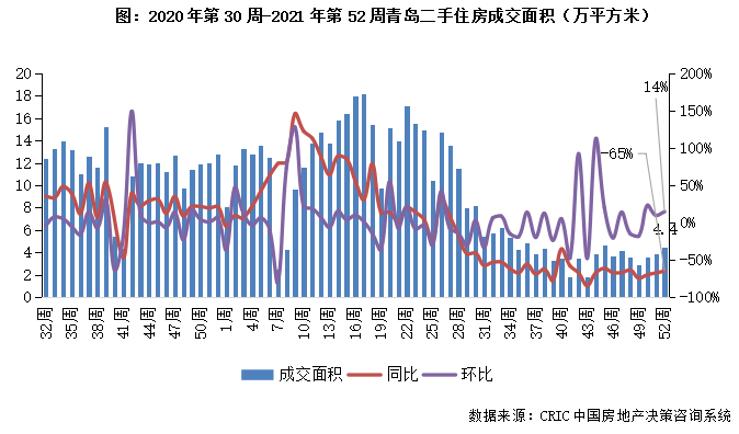 2021年第52周,青島二手住房成交面積環比漲14%、同比降幅收窄至65%,成交規模4.4萬平方米。市場長期嚴控下消費者普遍購房信心不足,當前成交規模持續低位運行,近期銀行信貸政策略有放松,市場連續3周回升但規模未有顯著放量,后市或持續穩中有升。