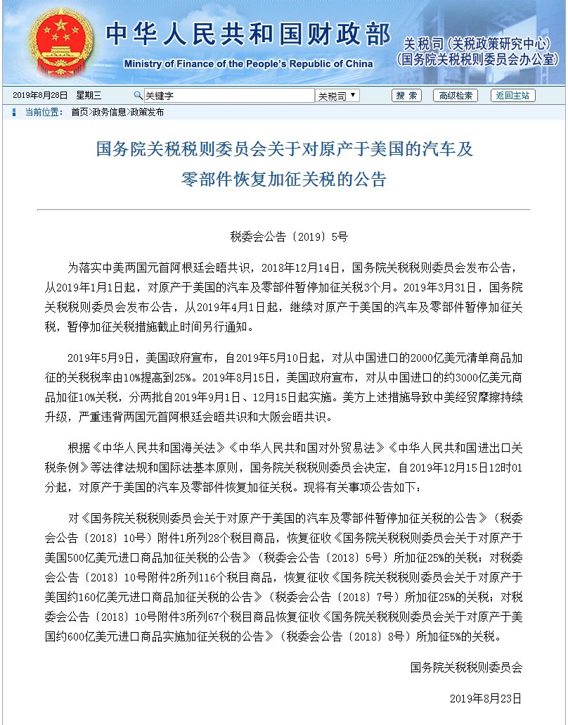 對此,8月23日晚,中國財政部發布公告恢復對原產于美國的汽車及零部件關稅征收,并公布了對原產自美國商品加征新關稅的計劃,將有5078個稅目、約750億美元的商品被加征10%、5%的關稅,且將在9月1日和12月15日分兩批實施。