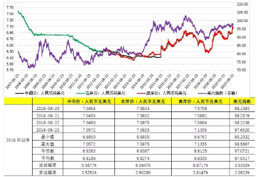2019年以來,人民幣中間價、在岸價和離岸價波動幅度分別為5.5677%、6.0447%、6.8717%。與此同時美元指數全年波動幅度則達到3.5330%。這一波動幅度基本已經相當于過去的全年波動幅度。