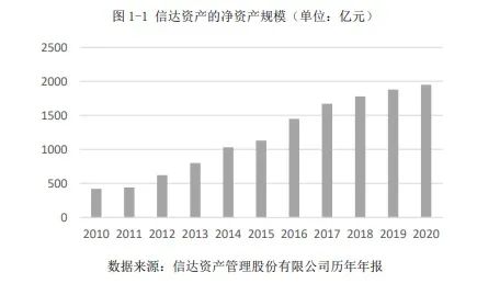 圖1-1顯示,信達(dá)資管成立時(shí)凈資產(chǎn)為100億,經(jīng)十年發(fā)展至2010年凈資產(chǎn)為425億,至2020年增長(zhǎng)至1950億;信達(dá)作為樣本反映了四大資管發(fā)展的三個(gè)階段:1是政策性資產(chǎn)包階段凈資產(chǎn)穩(wěn)步小幅增長(zhǎng);2是全面商業(yè)化后凈資產(chǎn)快速發(fā)展;3是2018年“回歸主業(yè)”后凈資產(chǎn)增長(zhǎng)大幅減緩。