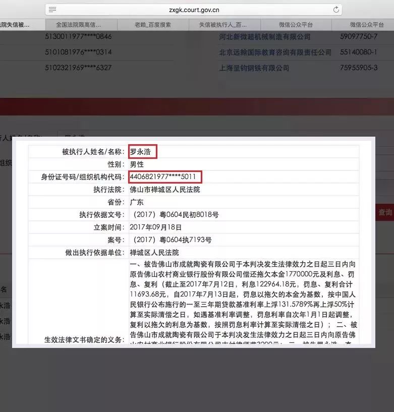 三條信息的案號與上文的1977年生的羅永浩為同一人。