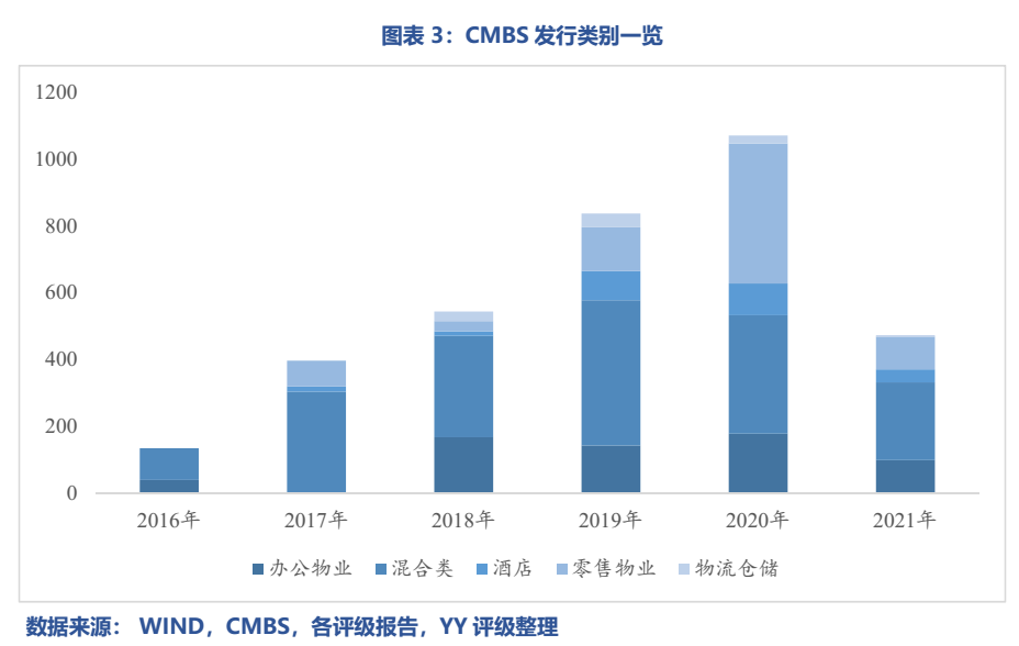 CMBS(商業地產抵押貸款支持證券)的特征為以商業地產為抵押、以相關商業地產未來收入(如租金、物業費等)為償還本息來源的資產支持證券產品。其中,商業地產往往包括一個或多個商場、寫字樓、酒店、公寓等商業地產的抵押貸款組合。而抵押貸款支持證券意味著相比REITS并不出表,往往通過信托計劃+專項計劃的雙SPV結構發行。另外,銀行間市場發行的稱為CMBN,現與CMBS大致類似,一般分類為CMBS/CMBN,下文統稱為CMBS。