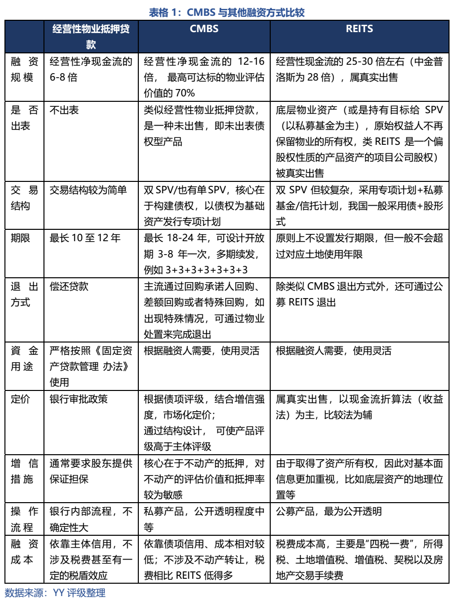 相比REITS的股性或經營性抵押貸款的間接融資特性,CMBS有更強債性。具體體現為相較REITS不真實出售,而相較經營性物業抵押貸款融資額較高、期限較長、資金使用限制相對較少。