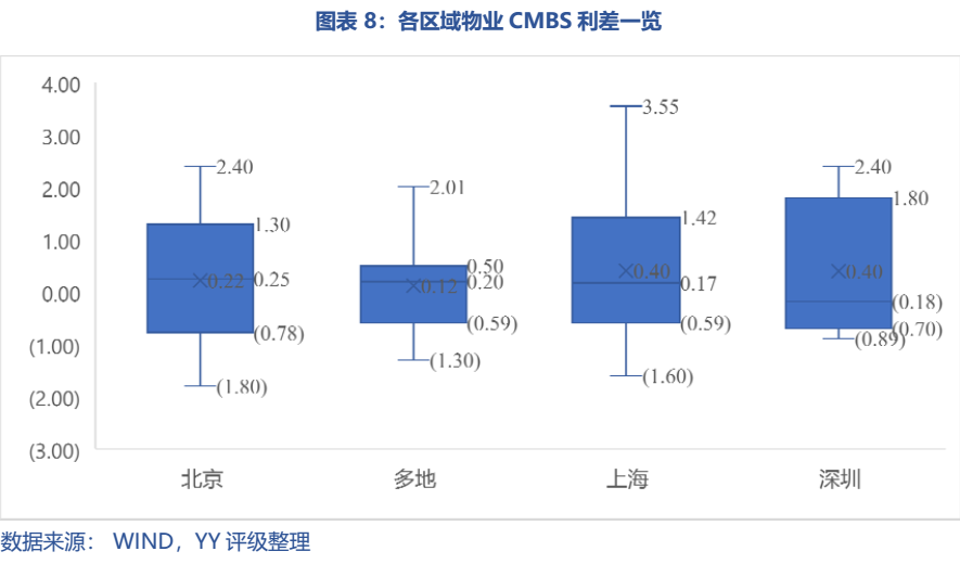 我們以A1優先級的CMBS與主體信用利差為例,不同資產類型和不同城市的利差皆有不同。其中辦公物業、混合類、酒店、零售物業、物流倉儲的平均利差約為36、14、45、7、22 bp;而我們只看重點城市北京、上海、深圳的話(多地為多地多個資產,平均12 bp)平均利差約為22、40、40bp。綜合而言,從利差角度,市場對核心城市(北上深)的辦公物業、酒店、物流倉儲資產認可程度較好,高于總體平均利差,而混合類和零售物業類資產雖然占比很高但方差也較大。