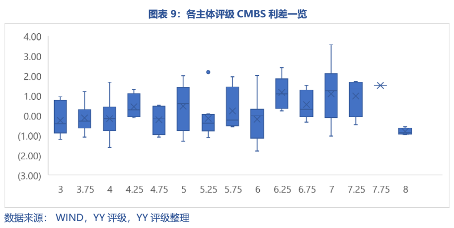 整體而言,取CMBS實際發行主體相近時間發行的3年期左右公司債或中期發行票面利率 – CMBS發行票面利率所得利差,體現CMBS的抵押和增信措施對債項的增信效果(或至少一級投資者認可的增信效果),一般而言>0的程度越高表示資產的增信程度越好。