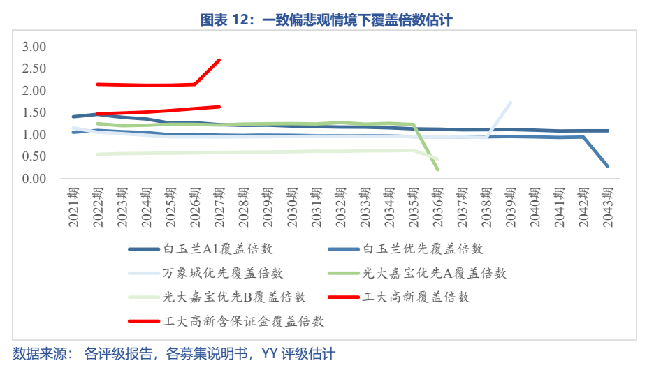 如圖14可見,在租金和出租率都偏悲觀(樂觀不消說除最后一期外都是足額的)的情況下,白玉蘭對A1級本息覆蓋倍數也一直保持在1以上,2027年開始對優先A2級利息覆蓋不足,但也在0.95以上,但無法保障A2級本金償還;萬象城只有一層優先級,悲觀預期下2024年開始優先級本息覆蓋倍數小于1,但也一直處于0.9以上;光大嘉寶對優先A級保障程度較好,但對優先B級幾乎肯定無法覆蓋本息,必然依賴主體信用;工大高新在考慮不考慮保證金的情況下覆蓋倍數都較好,考慮保證金的情況下覆蓋倍數更是達到了2左右。