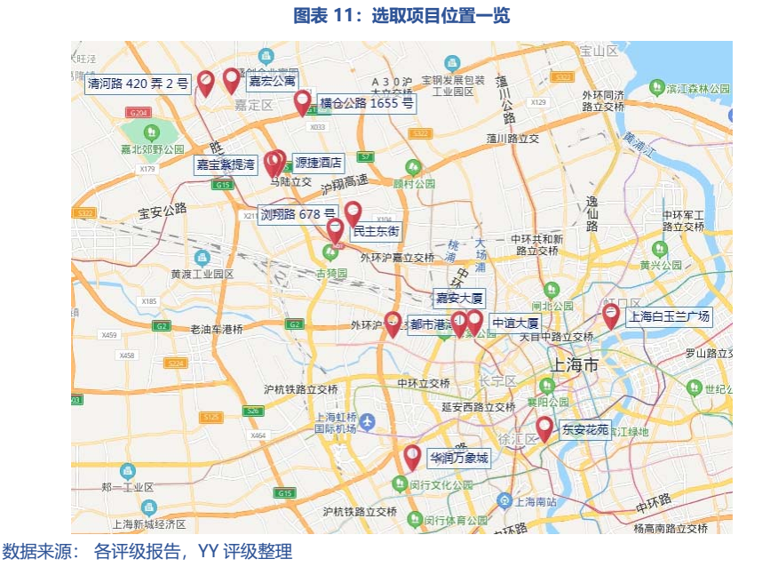 除光大嘉寶外,華潤萬象城、金光白云蘭均為中央活動區(外環內)單一地點的辦公、零售混合類物業,而光大嘉寶的資產池包含了6個零售物業、3個辦公物業和2個工業物業,且位置分散,基本都處于外環外。