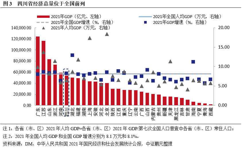 四川省經濟總量位于全國前列,但人均水平較低。四川是我國經濟大省,2021年全省GDP達5.39萬億元,位于全國第六,占全國GDP總量的4.71%;全省GDP增速為8.2%,高于全國平均增速;按常住人口計算,2021年四川省人均GDP為6.44萬元,是同期全國人均GDP的79.48%。