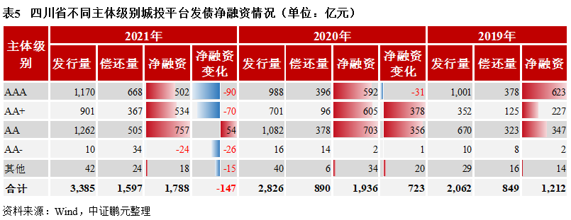 四川省城投債凈融資額位于全國前列,主要由AA級城投平臺貢獻。2021年四川省城投合計新增發債3,385億元,償還總量為1,597億元,凈融資1,788億元,凈融資額位于全國第四位,近三年全省城投債融資額持續凈流入。從不同主體級別的城投平臺凈融資來看,2020-2021年四川省城投債凈融資主要由主體評級為AA的城投平臺貢獻。2021年全省城投債凈融資額同比減少147億元,其中AAA和AA+級平臺發債凈融資額均同比下降,而AA級平臺凈融資額同比增長。