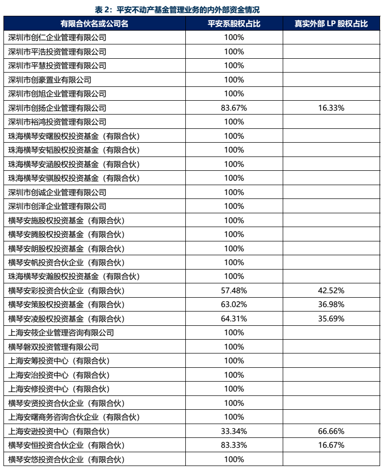 平安不動產有限公司由平安系相關企業100%控股,分別被平安人壽、平安財險、平安科技和平安融資租賃等公司持股。作為中國平安的不動產投資運營平臺,平安不動產的主要業務是基于搭建平安系的不動產投資基金管理業務而設。