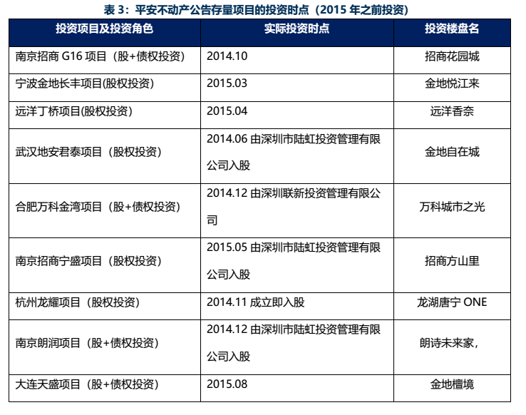 根據公司的20年中報,多數股權投資項目始于15年投資,近一步追溯相關公開信息網站,則可以發現平安不動產許多存續項目其實已在14年入股,并于15年中更換投資主體。