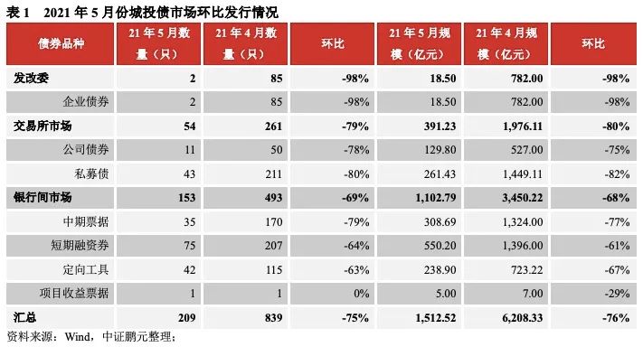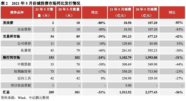 嚴監管下,5月城投債發行大幅下降。2021年5月份,各品種城投債共發行209只,發行規模1,512.52億元,較4月份發行數量和規模環比下降75%和76%。從同比來看,5月城投債發行數量同比下降31%,發行規模同比下降36%。