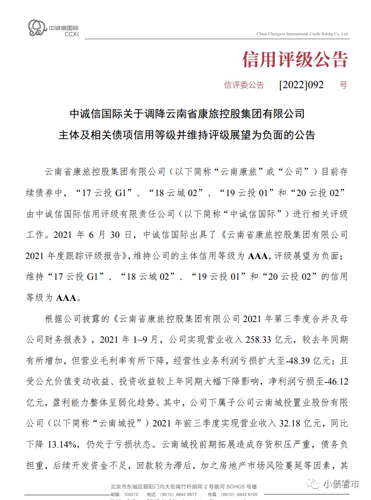 近日,中誠信國際公告稱,將云南省康旅控股集團(tuán)有限公司(以下簡稱“云南康旅”)主體信用等級由AAA調(diào)降至AA+,維持評級展望為負(fù)面;將“17云投G1”、“18云城02”、“19云投01”和“20云投02”的債項信用等級由AAA調(diào)降至AA+。