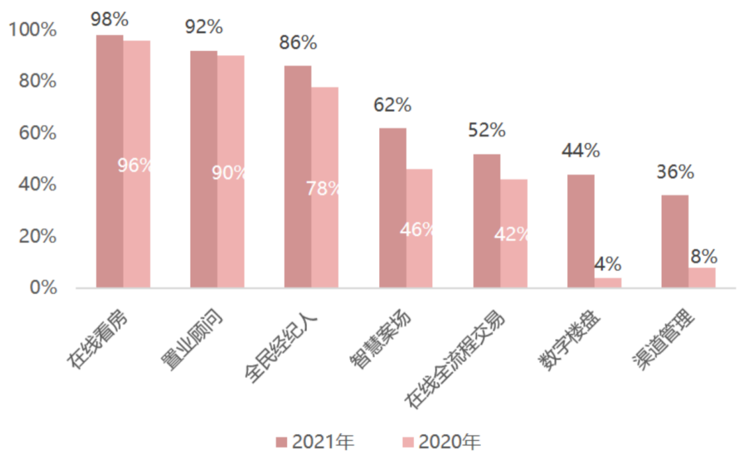 目前在線看房平臺、置業(yè)顧問工具、全民經(jīng)紀人系統(tǒng)、智慧案場等應用在頭部房企的普及度較高,相較2020年,場景建設比率均有所提升,在線看房平臺與置業(yè)顧問工具的應用保持穩(wěn)定增長且覆蓋率在90%以上。