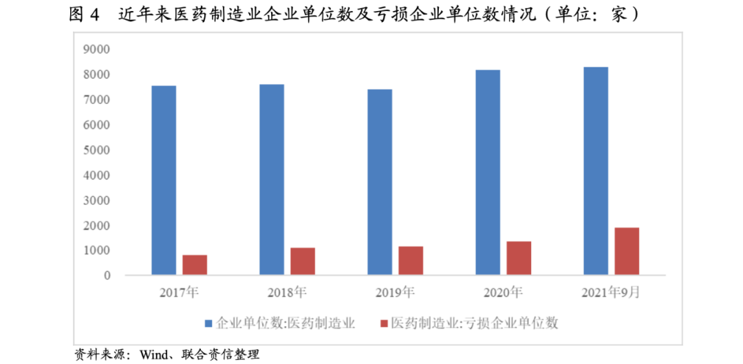 從行業主體數量來看,截至2020年底,醫藥制造業企業單位為8170家,較上年底增加778家;虧損企業1344家,較上年底增加193家。截至2021年9月底,醫藥制造業企業單位為8282家,較上年底增加112家;虧損企業1886家,較上年底增加542家。2020年以來,醫藥制造業企業數量增加較快,但虧損企業占比亦逐年上升,行業內分化程度加深。