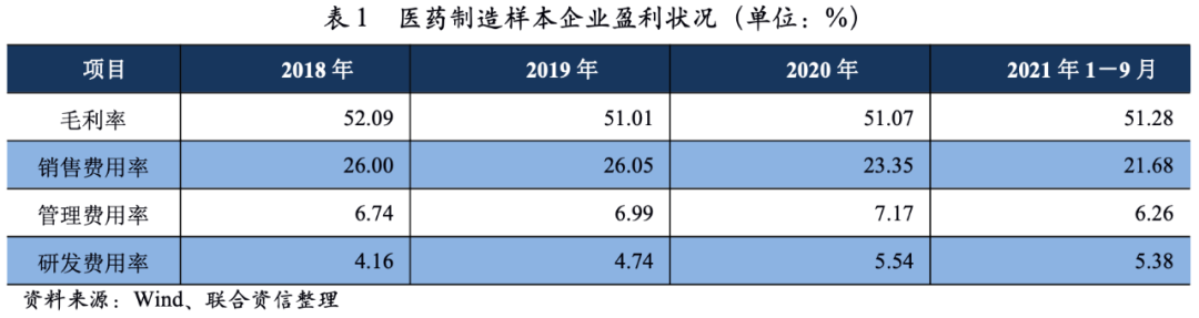 從醫藥制造業樣本數據分析[2]來看,2018-2020年,醫藥制造樣本企業銷售費用率分別為26.00%、26.05%和23.35%,波動下降,但處于較高水平。2021年1-9月,醫藥制造樣本企業銷售費用率為21.68%,較上年同期下降1.40個百分點。2018-2020年,頭部企業銷售費用率均大于27.00%,處于較高水平,對利潤水平存在一定影響。