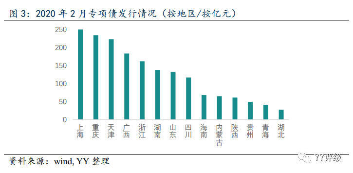 2月份專項債發行中,上海市、重慶市、天津市三大直轄市領跑,分別占比14.3%、13.4%、12.7%。從發行主體來看,除了青島市為地級市政府,其他發債主體都是省級人民政府或直轄市人民政府。