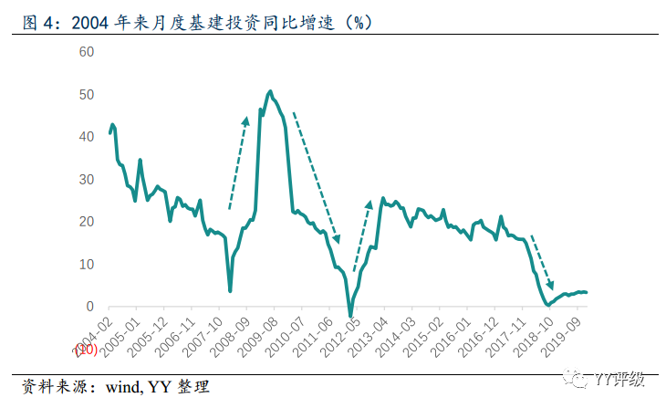 從歷史數據來看,基建投資大體上經歷了3次增速下跌以及2次強政策刺激。