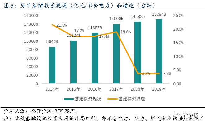2018年、2019年基建投資增速再次斷崖式下滑至3.8%,與核查清理PPP項目以及隱形債務問責有關,財政支出以及專項債額度等“正門”的擴大無法彌補非標等“偏門”的收縮,導致地方配套資金不足。
