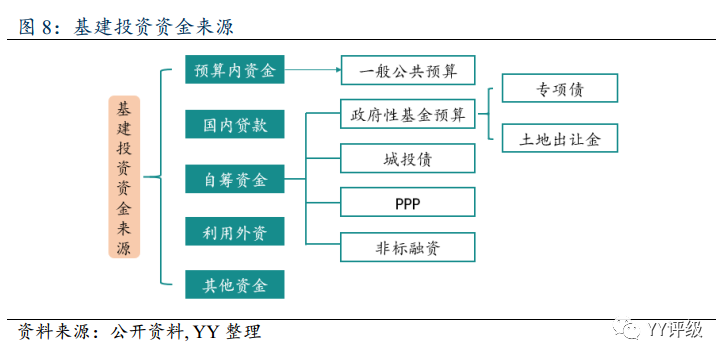 資金能否到位是基建項目能否落地的主要制約因素,基建投資的資金來源分為預算內資金、國內貸款、自籌資金、利用外資和其他資金。