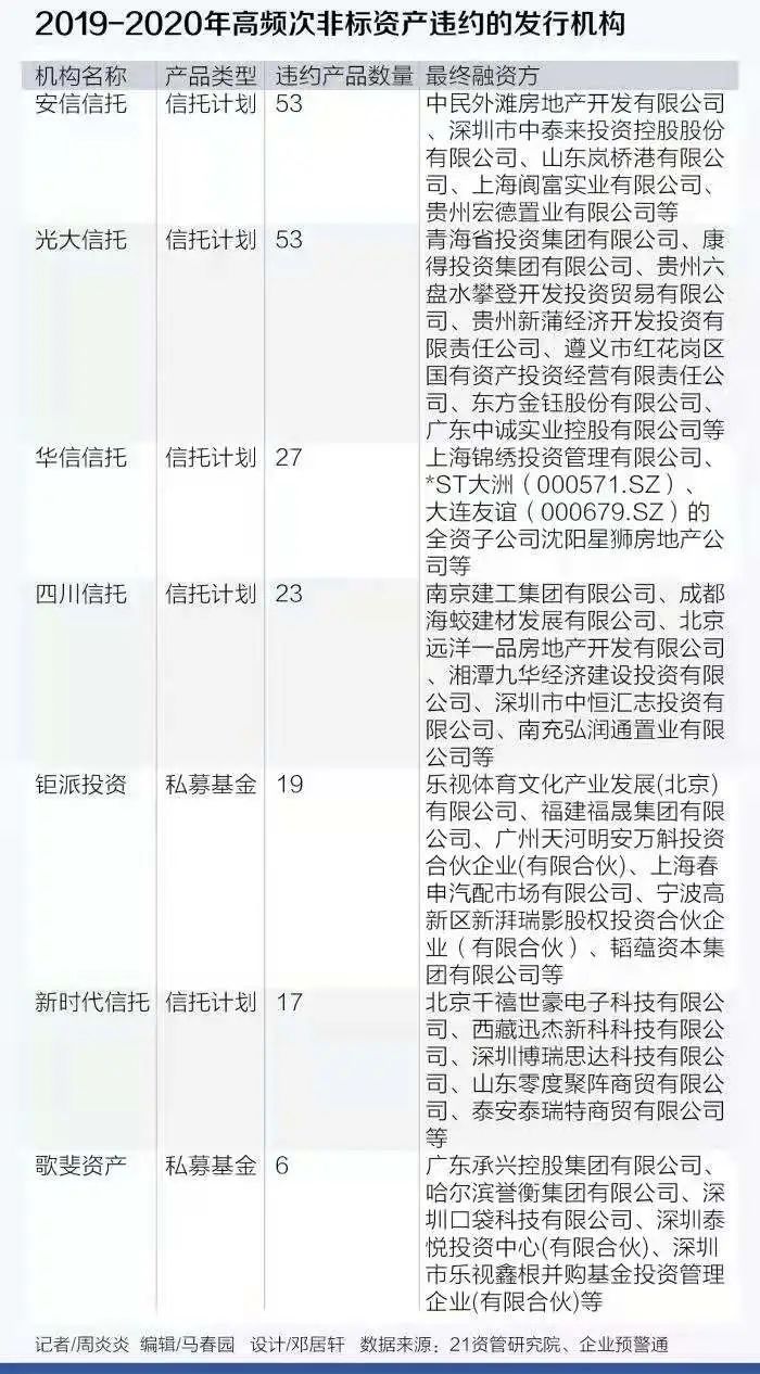 從21世紀(jì)資管研究院的數(shù)據(jù)顯示,2019-2020期間一共發(fā)生過的非標(biāo)違約債項(xiàng),僅從公開數(shù)據(jù)統(tǒng)計(jì)顯示就有超2200條之多。涉及信托計(jì)劃、券商集合、私募基金、期貨資管、銀行非保本理財(cái)和保險(xiǎn)資管,波及的資管機(jī)構(gòu)高達(dá)上百家。