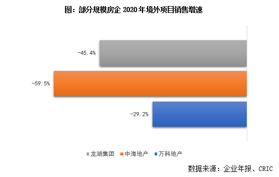 其一,2020年受疫情影響,房企境外項目的銷售業績呈顯著下滑。其中,中海地產境外項目銷售金額由2019年的111.89億元降至45.3億元,同比下降59.5%;萬科境外項目銷售金額同比下降29.2%,境外項目銷售金額占比由2019年的0.14%降至0.08%;此外,綠地2020年海外項目因疫情影響,銷售周期和開發周期進一步拉長,導致成本增加及折現時間加長,共計提跌價減值損失9.91億元。