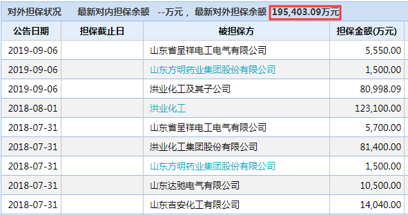 據(jù)公開數(shù)據(jù)顯示,玉皇化工對外擔保余額為19.5億,其中對洪業(yè)化工及其子公司的擔保余額為8億,在玉皇化工所有擔保企業(yè)中占比最高。