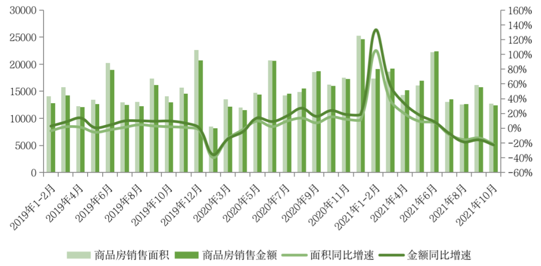 單月來看,2021年10月全國商品房銷售面積12719萬平方米,環比下降21%,同比下降21.6%,較9月降幅擴大8.4pct。2021年10月商品房銷售金額12390億元,環比同樣下降21%,同比下降22.6%,較9月降幅擴大6.8pct。