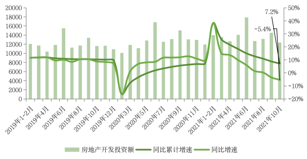 2021年1-10月,全國房地產開發投資124934億元,同比增長7.2%;比2019年1—10月增長14.0%。兩年增速較1-9月分別收窄1.6pct和0.9pct。10月單月完成開發投資額12366億元,同比下降5.4%,降幅較9月進一步擴大1.9pct,環比則下降14.8%。