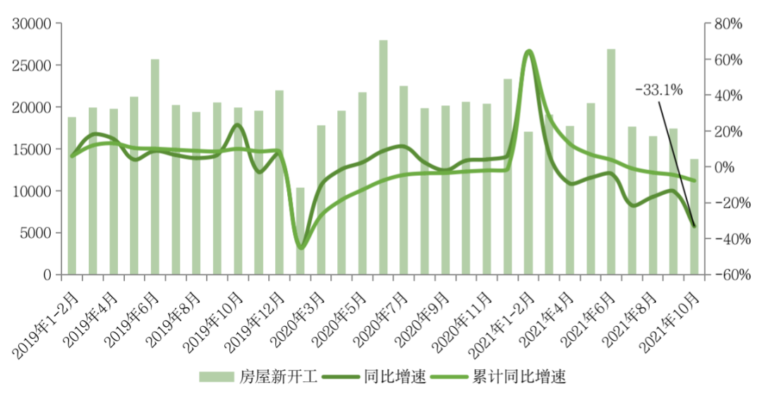 單月來看,10月全國新開工面積13792萬平方米,環比下降21%。同比降幅較9月大幅擴大19.6pct至33.1%,規模創2020年以來新低。民營開發企業在銷售回款難和融資借款難的雙重困境下,無力繼續新開工項目。