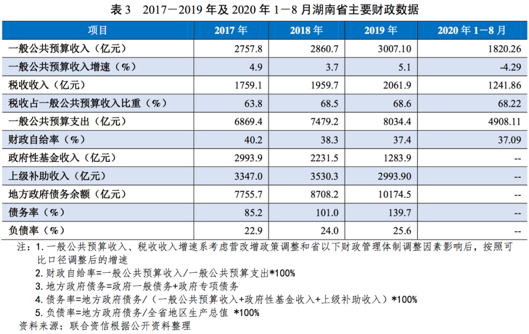 湖南省整體經濟實力較強,經濟總量及人均GDP處于全國中等偏上水平,經濟發展態勢良好。2020年前三季度,受新冠肺炎疫情影響,湖南省經濟增速明顯下滑,新冠肺炎疫情對湖南省經濟和社會發展造成一定影響。2019年湖南省一般公共預算收入規模位列全國第十三,一般公共預算收入穩定性較強,財政自給能力偏弱,整體財政實力一般。2019年,湖南省負債率為25.60%,債務負擔較重;湖南省債務率為104.95%,償債能力一般。