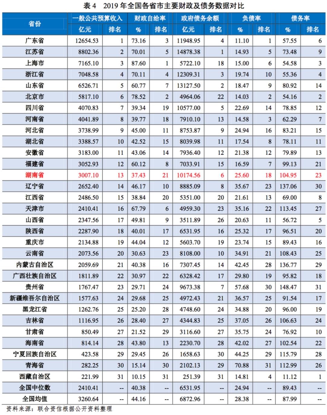近三年,湖南省一般公共預算收入持續增長,全省政府債務規模持續增長。2019年湖南省一般公共預算收入全國排名第十三,一般公共預算收入穩定性較強,但財政自給能力偏弱,整體財政實力一般;湖南省負債率在全國各省(自治區、直轄市)中處于較高水平,政府負債水平較高,債務負擔較重;湖南省債務率在全國各省(自治區、直轄市)中處于較高水平,償債能力一般。