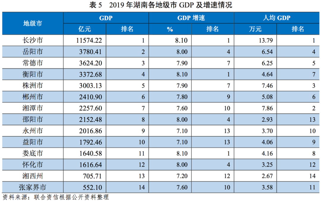從GDP增速來看,2019年,湖南省各市(州)GDP增速均維持在較高的水平。長沙市、岳陽市、衡陽市、邵陽市、婁底市和懷化市等6個地級市GDP增速達到8.00%及以上,永州市及益陽市GDP增速位于全省最低水平,但也保持在7.1%的增速水平。整體上,湖南省各地級市GDP維持較高增速。