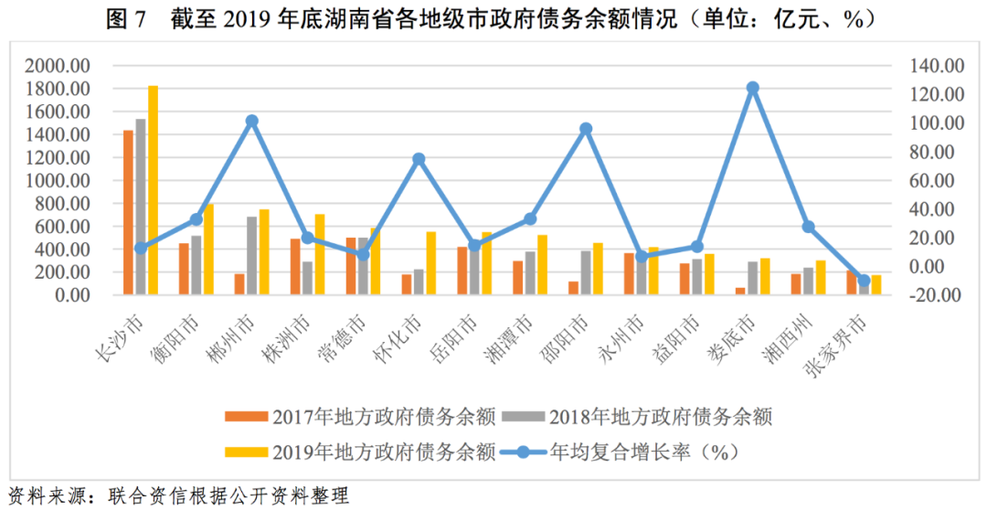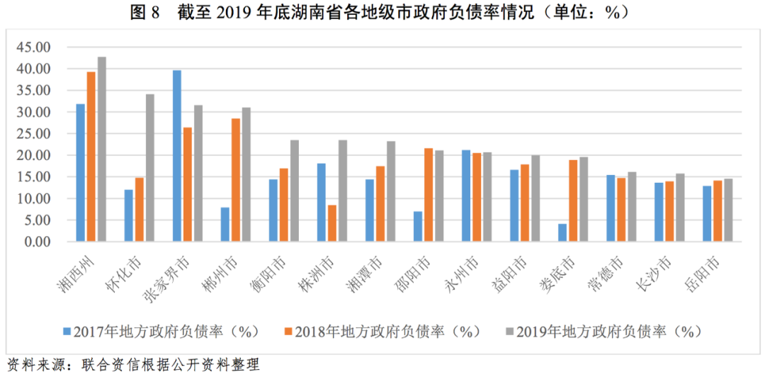 湖南省各地級市的債務規模差異較大,張家界市、株洲市、湘潭市和郴州市“發債城投企業全部債務+地方政府債務”/GDP的比值較高,湘潭市、張家界市、株洲市、郴州市、長沙市和常德市地方政府財政收入對“發債城投企業全部債務+地方政府債務”覆蓋程度相對較低。