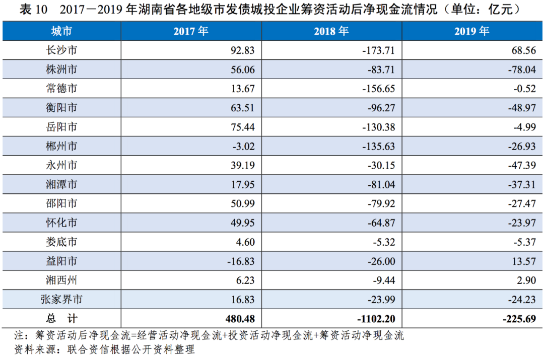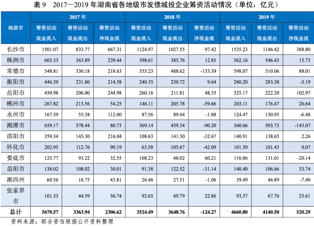 從湖南省各地級市發債城投企業籌資活動凈現金流狀況來看,隨著2019年下半年以來融資環境的逐步寬松,除湘潭市外各地級市發債城投企業2019年籌資活動現金流入規模均有所增長,湘潭市、衡陽市、婁底市、永州市和湘西州受2019年到期債務規模大當年籌資活動現金流出規模有所增長影響,其籌資活動凈現金流規模出現不同程度下降,湖南省大部分地級市籌資活動凈現金流較2018年均有所改善,其中長沙市、常德市、郴州市和益陽市籌資活動凈現金流增長最為明顯。
