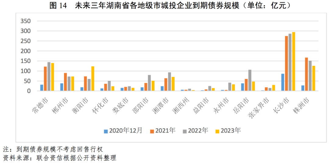 從湖南省各地級市發債城投企業未來三年(2020年12月、2021-2023年)到期債券規模看,長沙市、株洲市和常德市的城投企業未來三年集中到期債券規模大,湘西州、益陽市、張家界市和婁底市城投企業到期債券規模相對較小。