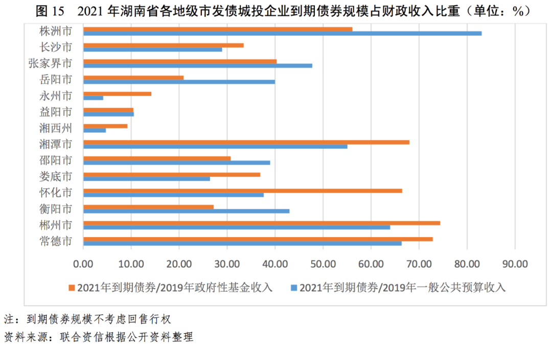 從城投企業2021年到期債券規模占一般公共預算收入或政府性基金收入的比重來衡量一般公共預算收入或政府性基金收入對到期債券的覆蓋情況,償債能力偏弱的城市為常德市、株洲市、郴州市和湘潭市。以截至2019年底城投企業2021年到期債券占綜合財力比重來近似衡量2021年城投債券的到期償還能力,株洲市、郴州市、湘潭市和常德市城投企業2021年到期債券占地方政府綜合財力的比重均較高,分別為23.87%、17.95%、15.51%和14.60%。總體看,株洲市、郴州市、湘潭市和常德市城投企業2021年到期債券的集中償付壓力較大。