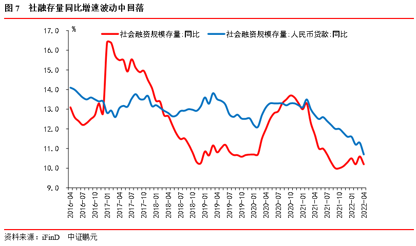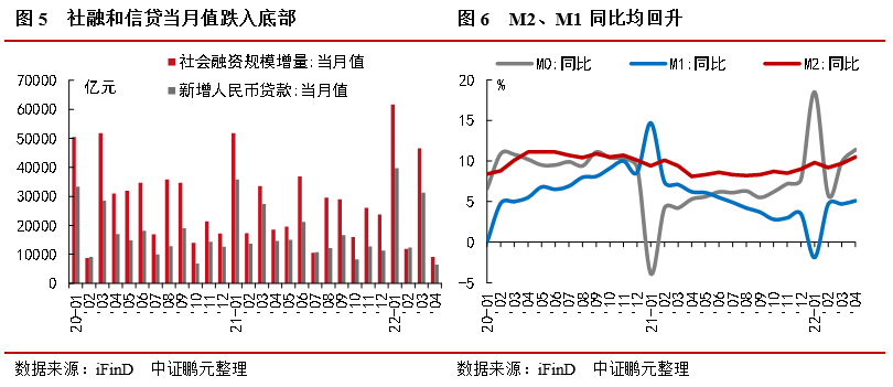 4月社融信貸跌入底部,主因是疫情影響,預計4月就是數據的底部。隨著上海疫情好轉,復工復產的持續進行,后續疫情對經濟的沖擊逐漸減弱,社融將逐步回歸。當前消費和地產處于低谷,消費隨著疫情和城市解封會逐步恢復;地產的低谷持續了較長時間,今年以來全國100多個城市的放松政策并未對地產形成有效的拉升,我們認為后續地產需繼續因城施策,加大放松力度。