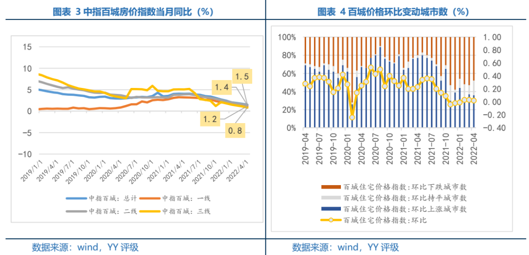 價格方面百城價格同比和環比均回落,其中一、三線同比下降幅度較3月更大。一線城市需求主因疫情限制,而弱三線普遍仍是“以價換量”思路,但結合銷售規模來看,此效果已大打折扣。環比上漲城市減少1個,新增6個持平,更多地城市房價維持低迷常態,三線城市價格反彈的趨勢目前來看并不成立。