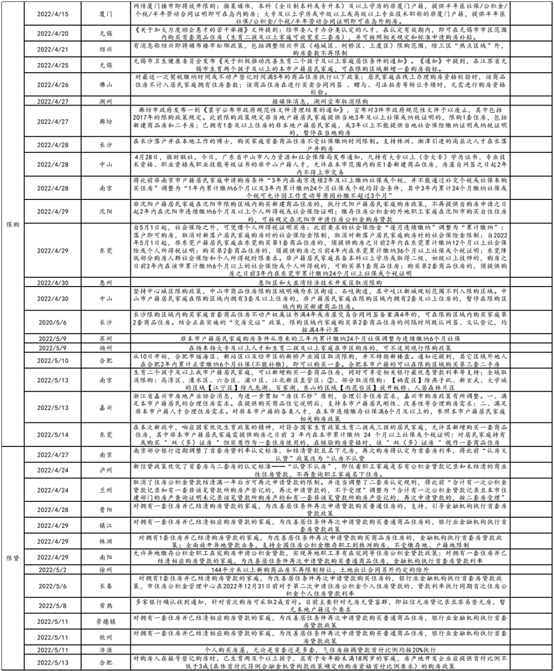 截至5月16日,22年以來全國累計出臺紓困政策近300次,當前樓市松綁較之前進入第二階段,更多省會強二線城市加入,如成都、杭州、蘇州等,更有長沙提出的創新思路即“鼓勵存量房做租賃房”,但這些政策實操層面有諸多限制,且更大目的在下行時托市,針對于遠郊和二手房市場,邊際改善程度有限。