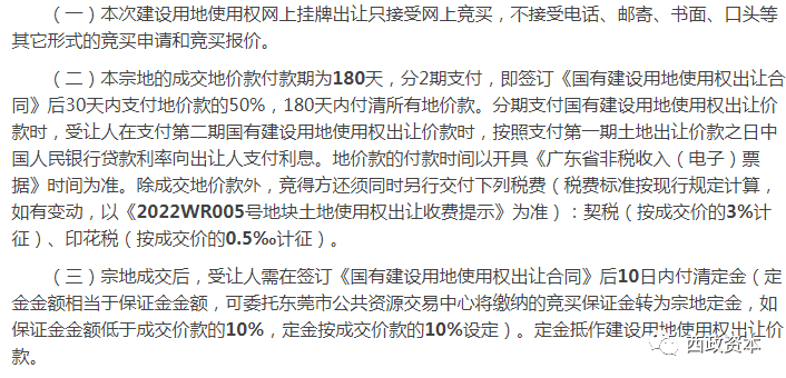 2022年3月13日,東莞首批集中供地8宗地塊正式掛牌上線。常規要求方面,競拍主體須具備房地產開發資質、須以自有資金參拍,同時限制馬甲參拍。競價規則方面,若競買申請人的最高報價不超過(即小于等于)最高限制地價,則按照價高者得原則確定競得入選人及成交地價款;當報價達到最高限制地價時仍有兩個或兩個以上競買人要求競買的,交易系統暫停報價,轉為通過網上終次報價方式確定競得入選人,最終以終次報價中最接近所有終次報價平均價的原則確定競得入選人,其所報的終次價格為成交價 。