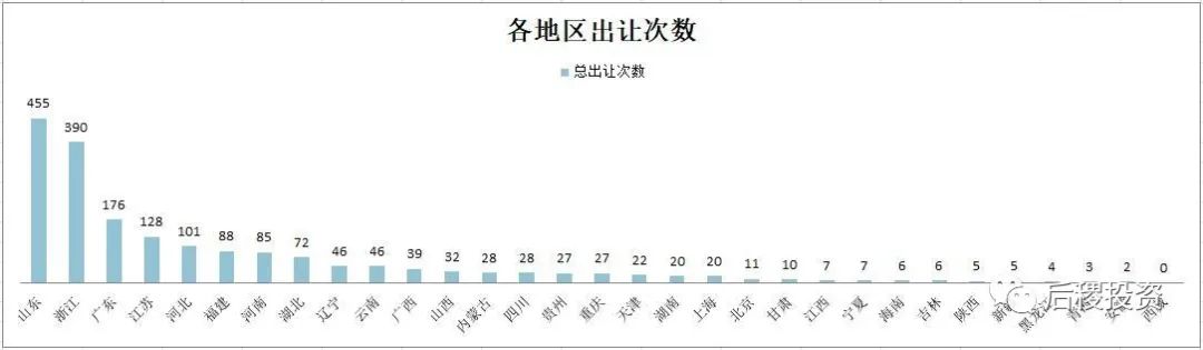 從上圖看,銀行出讓成交次數前五的省份是山東、浙江、廣東、江蘇和河北;戶數前五的省份是浙江、江蘇、福建、河南和河北,廣東排第六;而出讓總額排名前五的省份是浙江、河南、廣東、山東和江蘇,福建、遼寧、河北、山西緊隨其后,較其他地區為高。仍舊可以看出東部地區省份,銀行的出讓力度較其他地區為高,當然這也與我國的經濟總量分布有關。
