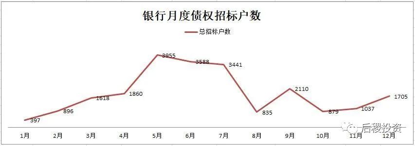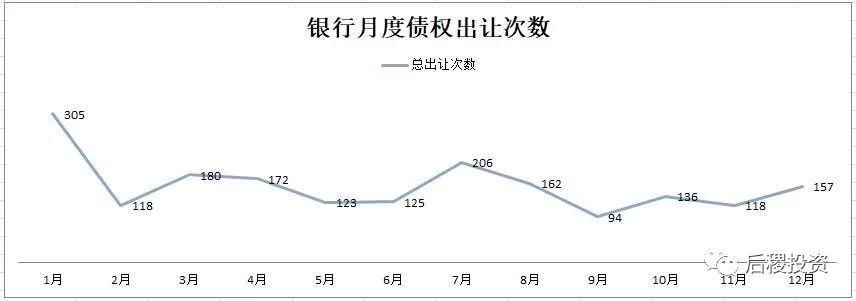 除1月外,銀行月度出讓次數曲線的區間為94-206次,區間中值為150次左右,戶數區間為827-2776戶,區間中值為1800戶左右,而月度出讓成交金額的區間中值則為350億元左右。1月和7月是公告成交的高峰期,這與業務規律也契合。