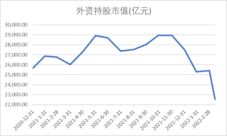 可能是出于對地緣政治擔(dān)憂,外資增持A股的趨勢在2021年5月戛然而止,之后便步入了減持通道,持股市值從最高峰的2.8萬億元下降到現(xiàn)在的2.2萬億元。