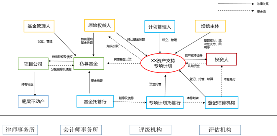 通過(guò)系列資產(chǎn)重組安排,實(shí)現(xiàn)私募基金持有項(xiàng)目公司的股權(quán)和債權(quán),項(xiàng)目公司持有物業(yè)資產(chǎn)的結(jié)構(gòu)。資產(chǎn)管理人向投資者募集資金設(shè)立專(zhuān)項(xiàng)資產(chǎn)支持計(jì)劃,并發(fā)行資產(chǎn)支持證券。管理人以認(rèn)購(gòu)資金向原始權(quán)益人購(gòu)買(mǎi)原始權(quán)益人持有的基金份額及其相關(guān)附屬擔(dān)保權(quán)益(如有),實(shí)現(xiàn)基礎(chǔ)資產(chǎn)由原始權(quán)益人向?qū)m?xiàng)計(jì)劃的轉(zhuǎn)讓。