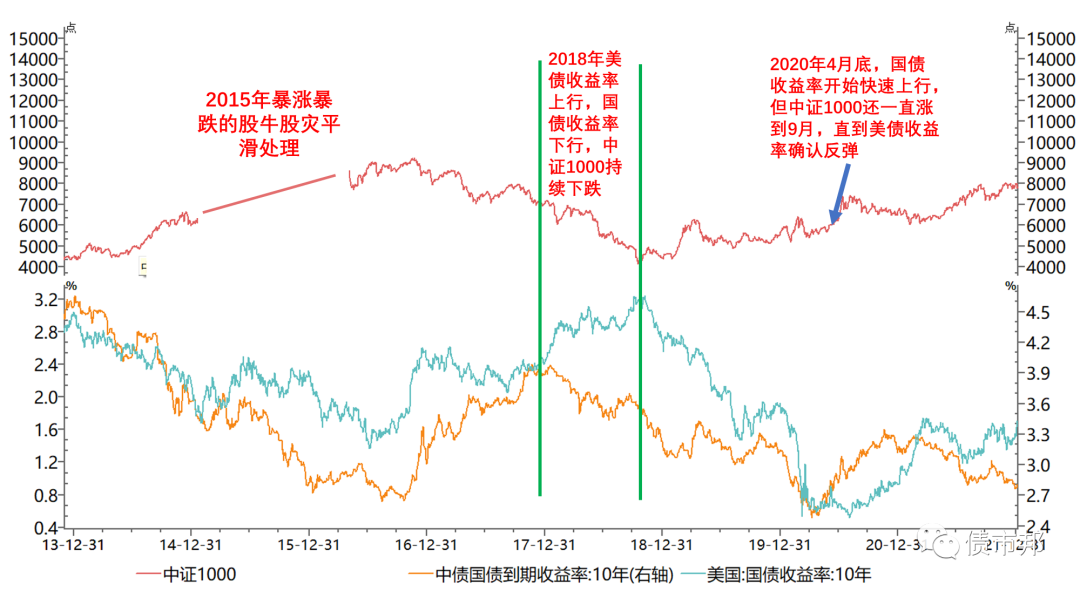 從下圖可以看到,中證1000指數的重要拐點,均與美債的底部頂部密切相關。