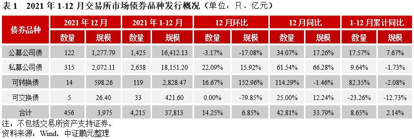 綜合1-12月來看,交易所債券市場共發行信用債券4,215只,發行規模37,813億元,數量同比上升8.7%,規模同比上升2.1%。其中,公募公司債的發行規模累計同比上升7.7%,私募公司債的發行規模累計同比減少1.7%。