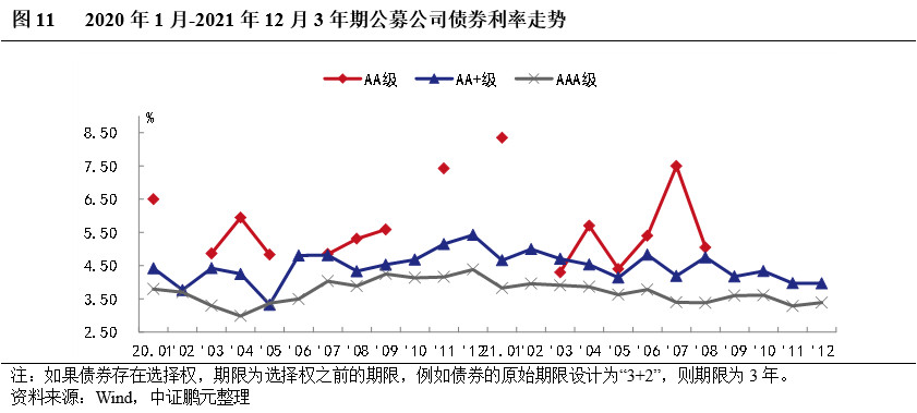12月份交易所公司債券整體利率和利差基本上行。就發行利率而言,2021年12月份交易所公司債券的最高利率為8.0%,較上月下行50個BP;最低發行利率為2.68%,較上月上升18個BP。與11月份相比,公募公司債券方面,AAA級平均發行利率上行25BP、利差擴大29BP,AA+級平均發行利率上行31BP,利差擴大38BP;私募債券方面,AAA級平均發行利率上行29BP、利差擴大30BP,AA+級平均發行利率上行46BP,利差擴大53BP,AA級發行利率下行2BP、利差擴大4BP。